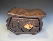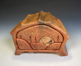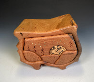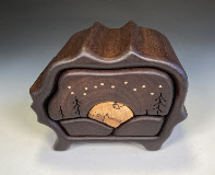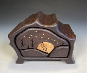 Moon Over the Mountain 1 drawer push- with secret compartment walnut, hackberry,brass 6.5"L x 5”W x 5”H order number W- $225 |